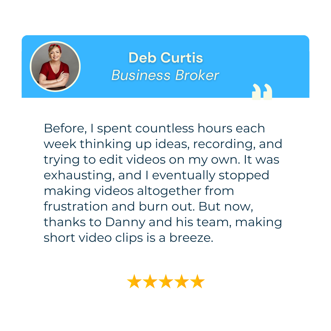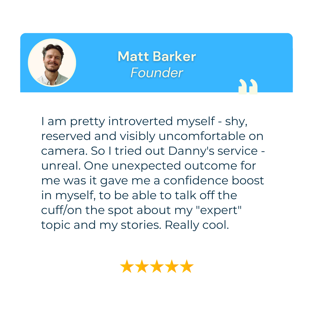 You know you need to be on video. You can do it yourself but you probably won't. And it definitely won't be as good. I've got a proven system to heliver high-quality video content fast and stress-free.Book a call with me and let's put your video on easy mode.